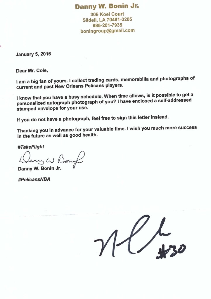 Autograph #71 – This is an autographed letter from Norris Cole formally with the New Orleans Pelicans Basketball. Cole played point guard for the Pelicans from 2014-2016. Norris was drafted by the the Chicago Bulls in the 1st round (28th pick, 28th overall) in the 2011 NBA Draft out of Cleveland State University. Norris was then traded by the Chicago Bulls with Malcolm Lee and cash to the Minnesota Timberwolves for Nikola Mirotić. Norris was then traded by the Minnesota Timberwolves to the Miami Heat for Bojan Bogdanović.