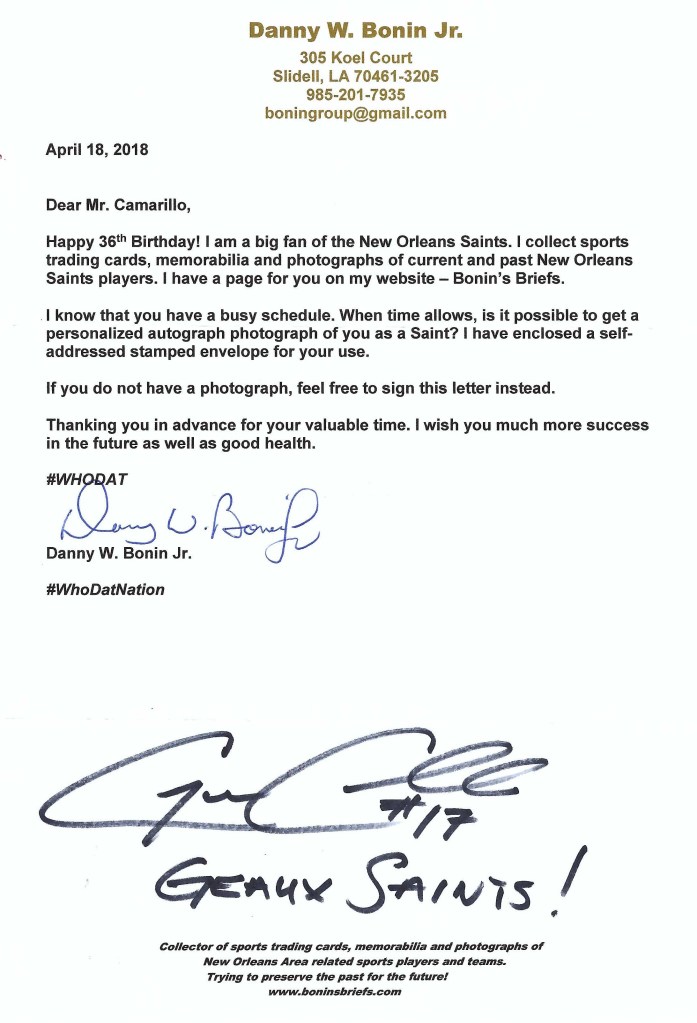 Autograph #77 – This is an autographed letter of Greg Camarillo with the New Orleans Saints. Camarillo was a wide receiver for the Saints in 2012. Camarillo was signed as an undrafted free agent by the San Diego Chargers in 2005 from Stanford University.