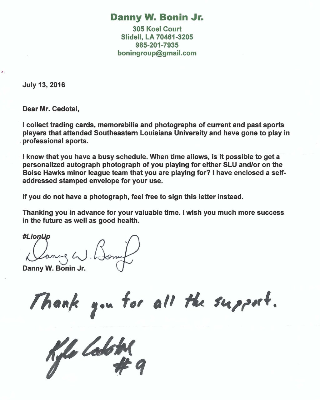 Autograph #78 – This is an autographed letter from Kyle Cedotal formerly of the Boise Hawks. Cedotal pitched and played Leftfield and Centerfield for the Hawks from 2016-2017. Cedotal was drafted by the Colorado Rockies in the 20th round of the 2016 MLB June Amateur Draft from Southeastern Louisiana University. Cedotal did not make it to MLB.