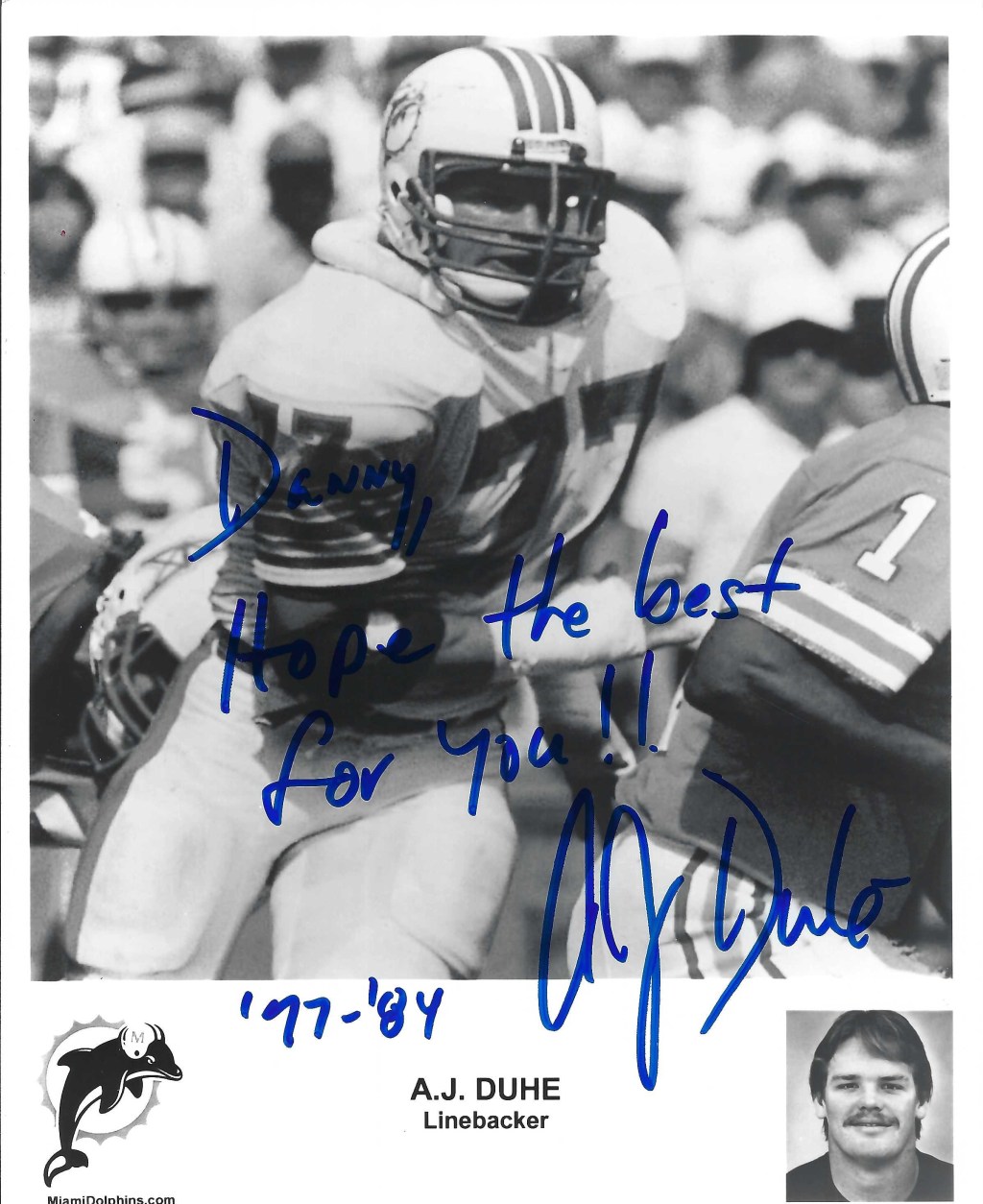 Autograph #96 – This is an 8X10 autograph photograph from former Miami Dolphins linebacker A.J. Duhe. Duhe was drafted in the 1st round (13th overall) of the 1977 NFL draft by the Miami Dolphins out of LSU. Duhe played for the Dolphins his entire NFL career from 1977 to 1984.
