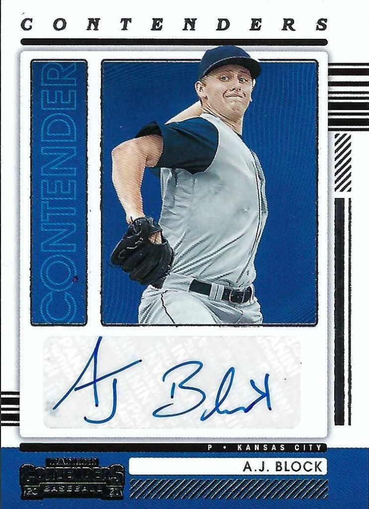 Autograph #105 – Added to our personal collection – 2021 Panini Contenders Auto AJ Block #CA-AB Kansas City Royals. We purchased it off of eBay.