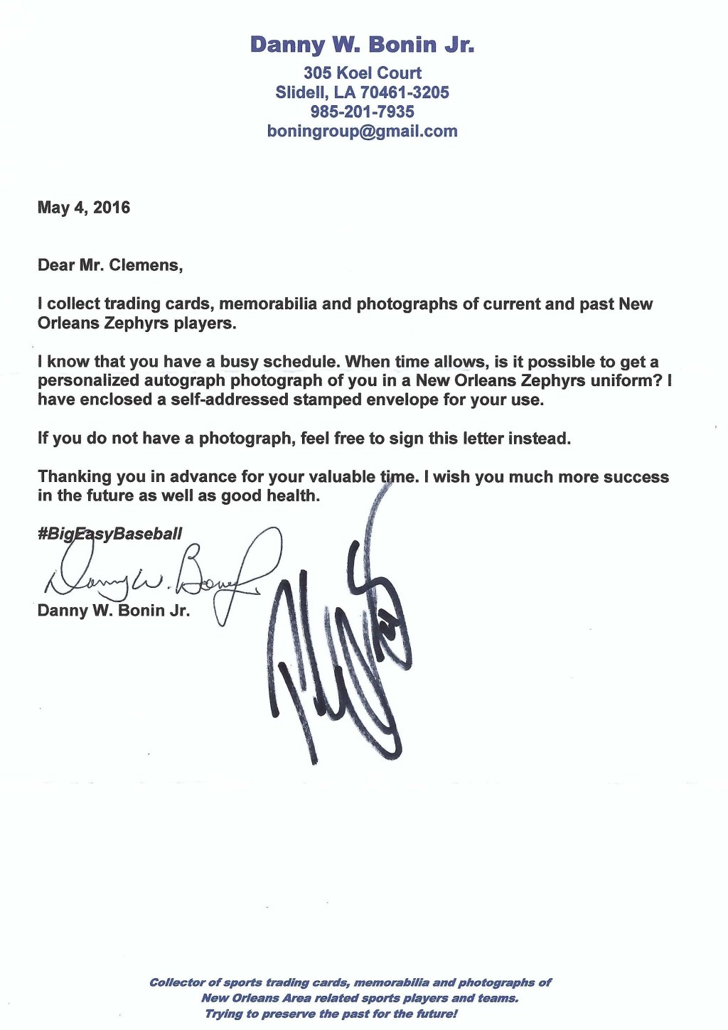 Autograph #108 – This is an autographed letter from Paul Clemens formerly of the New Orleans Zephyrs. Clemens pitched for the Zephyrs in 2016. Clemens was drafted by the Atlanta Braves in the 7th round of the 2008 MLB June Amateur Draft from Louisburg College. Clemens made it to MLB playing with the Houston Astros, Miami Marlins and San Diego Padres.