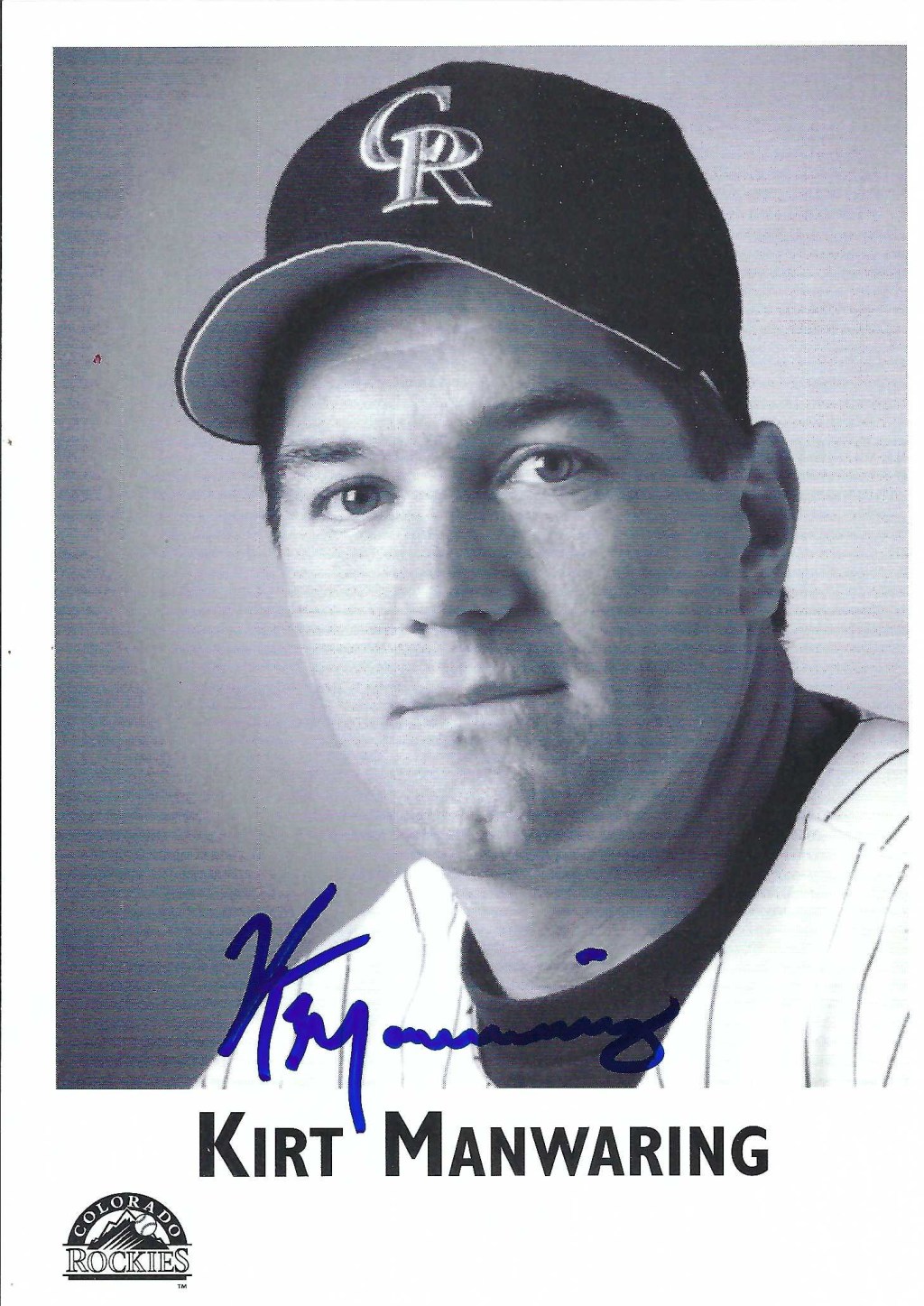 Autograph #178 – Today we received an autographed 5X7 photograph from our request to former MLB catcher Kirt Manwaring (Autograph request #102) in a Colorado Rockies uniform. It took 15 days to get his response. We sent our request to Kirt Manwaring, 18690 SE Lakeside Way, Jupiter, FL 33469-8111. Thank you Mr. Manwaring!