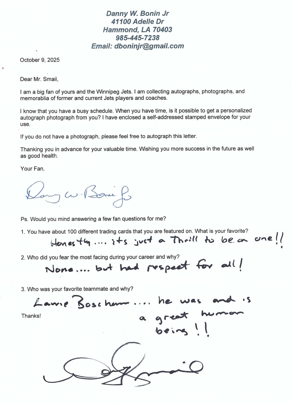 #autographrequestthroughthemail #autographs #autographcollection #hockey #NorthDakotaStateBison #NHL #Winnipegjets #DougSmail #AutographCollectingwDannyB