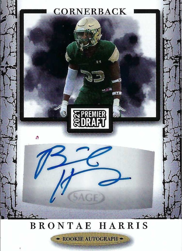 Autograph #203 – added to our personal collection – 2021 SAGE Premier Draft Autographs Black Brontae Harris. Pulled from a box of 2021 Sage.
