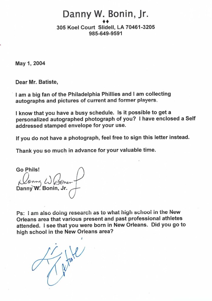 Autograph #246 – Part of our autograph collection is this autographed letter we sent to Kim Batiste with the Philadelphia Phillies back in May of 2004. We don’t know when we received his response but he sent back several items that were autographed.