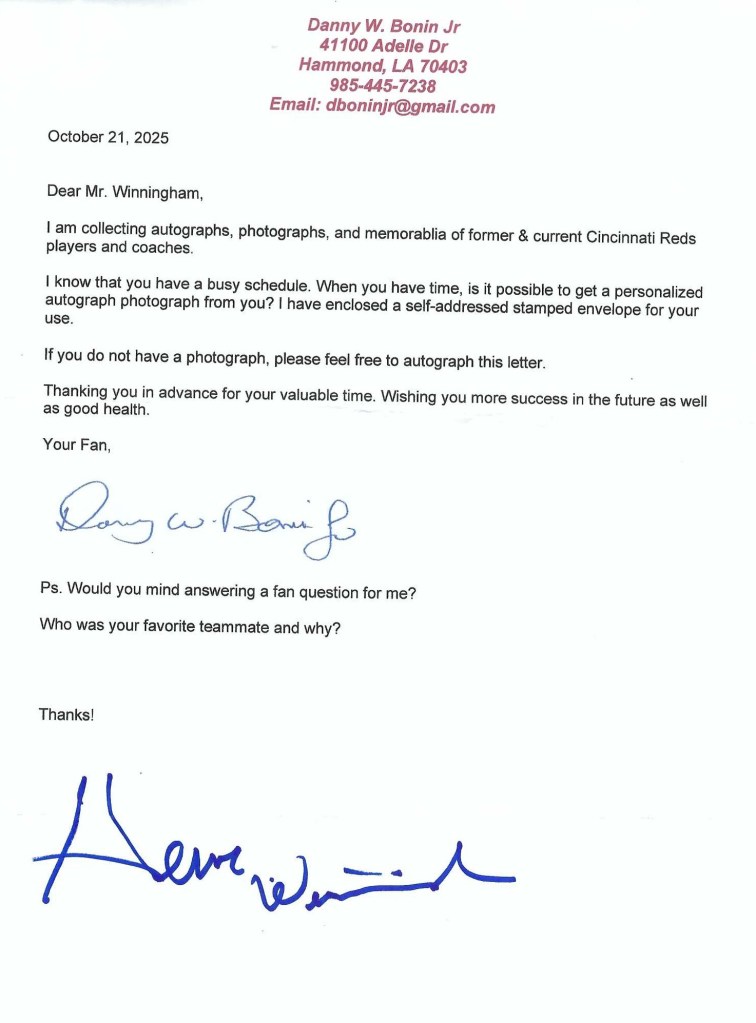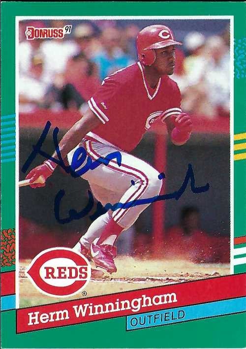 Autographs #267, 268, 269 & 270 – Today we received a response to our Autograph Request #104 – Herm Winningham. It took 87 days to receive a response. We received autographs on his 1989 Score, 1990 Topps & 1991 Donruss trading cards. He additionally signed our request letter asking for an autograph. We sent our request to Herm Winningham, 151 Sedgerfield Dr., Orangeburg, SC. 29115. Thank You Mr. Winningham.