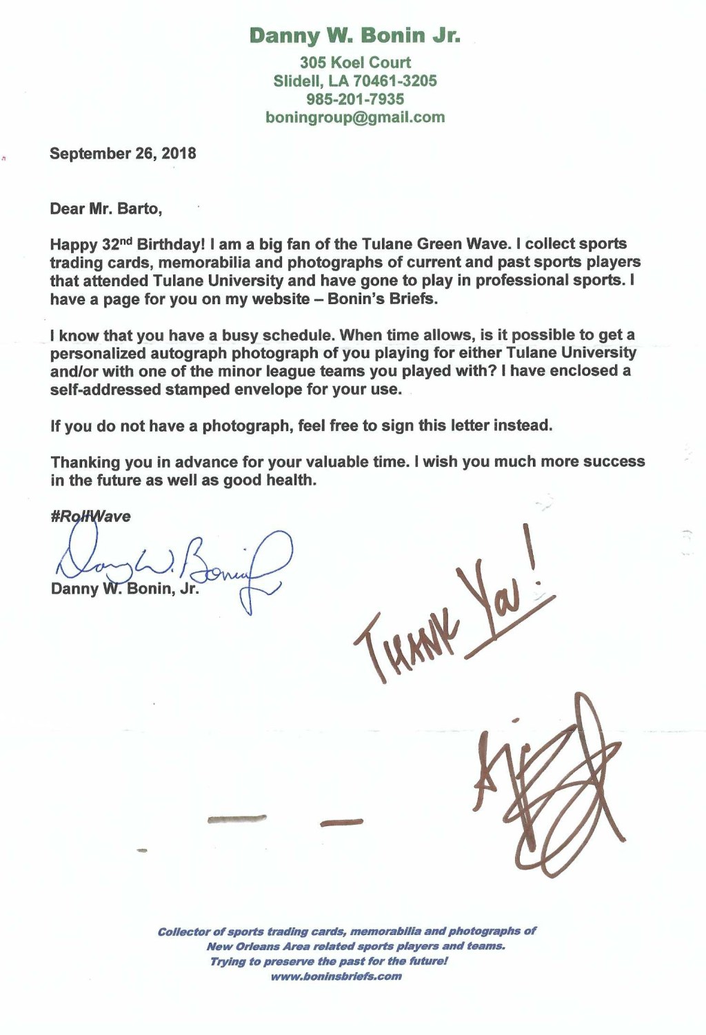 Autograph #284 – This is an autograph from former MiLB Outfielder Aja Barto. Barto signed our autograph request letter and sent some signed trading cards that you can find in earlier post. We sent our autograph request to him on September 26, 2018 but we do not have a record of when we received his response.