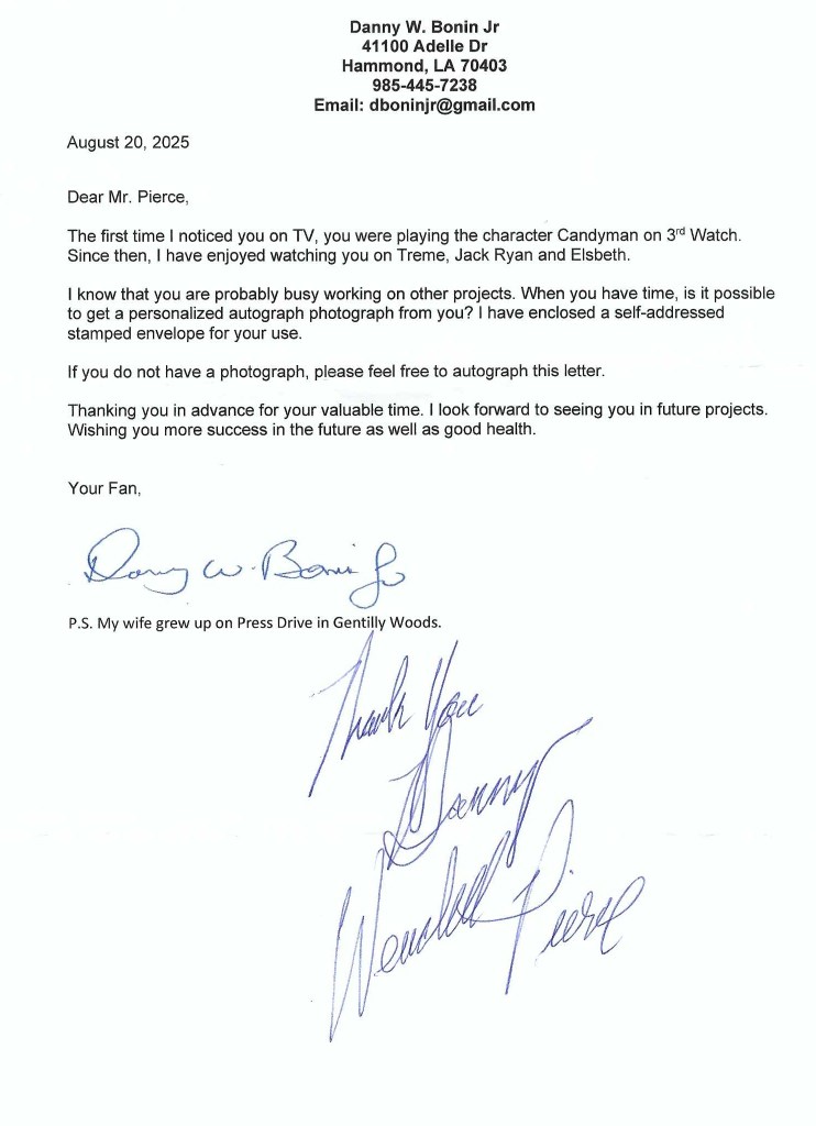 Autograph #332 – Today we received a response to our Autograph Request #25-8-14 – Actor Wendell Pierce. He signed our autograph request letter. It took 181 days to get his response making it now the longest response that we had to wait for. We sent our request to Wendell Pierce, 5630 Debore Dr, New Orleans, LA 70126. He was probably in town for Mardi Gras. Thanks Mr. Pierce.