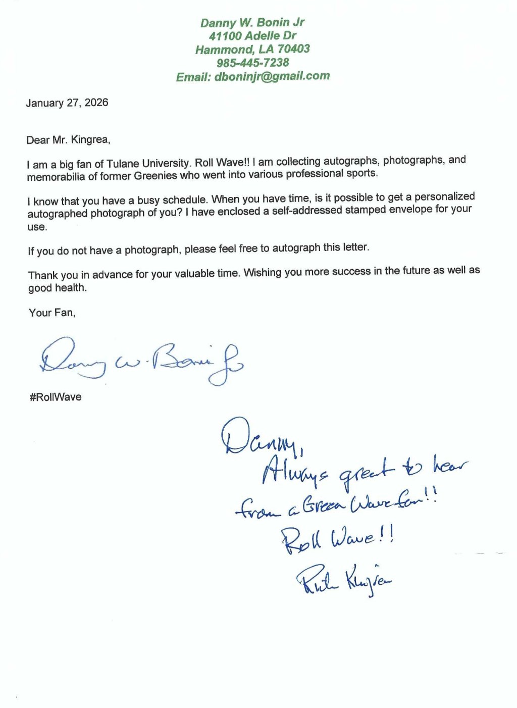 Autograph #347 – Today we received a response to our Autograph Request #159 – Rick Kingrea. He autographed our letter requesting an autograph. It took 69 days to receive his response. We mailed our request to 102 N Bayview St., Fairhope, AL 36532. Thank you Mr. Kingrea.